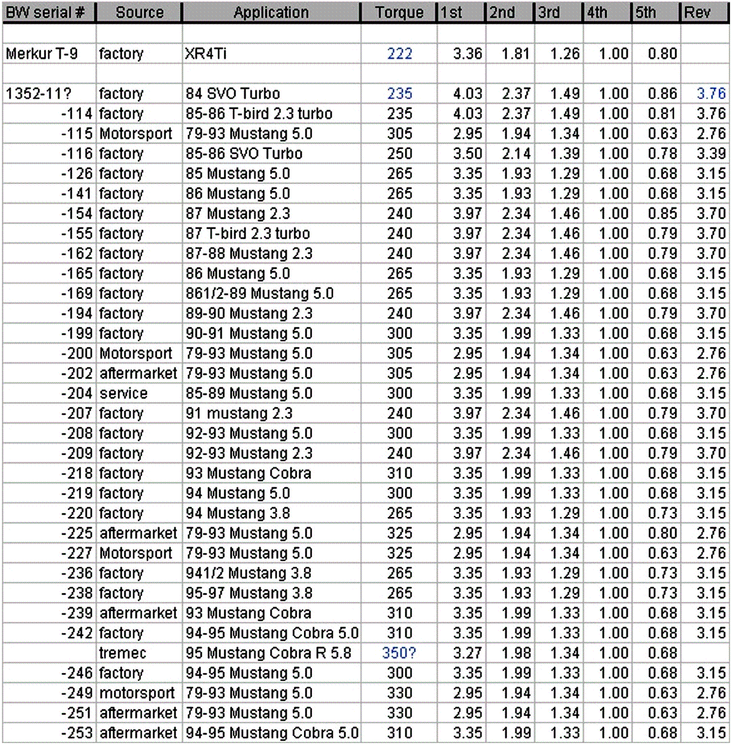 The couple we broke in turbo Mustangs were V8 Mustangs. R&T Mag timed our mustang at 185+ at the Firestone test track in Fort Stocton, Texas. We later put one thru the 1/4 mile at 10.85 @ 121mph. These were equipped with the Super Duty T5's. "Super Duty" implied a change in the synchro, as I recollect.