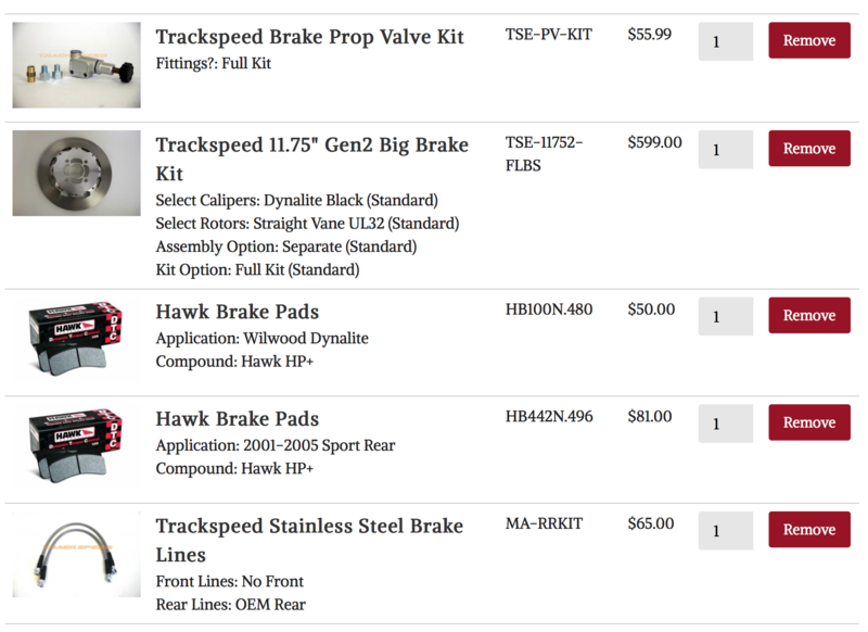 Can you help me check availability of these items and check if I missed any components for complete brake upgrade?