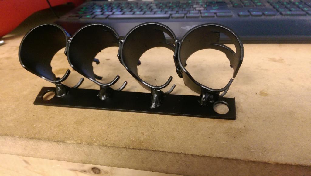 Here's what I came up with to hold the things in the stock location. At an angle, because the 45deg boot ends are cheapest and I've got more clearance for a reroute if I ever get around to it.