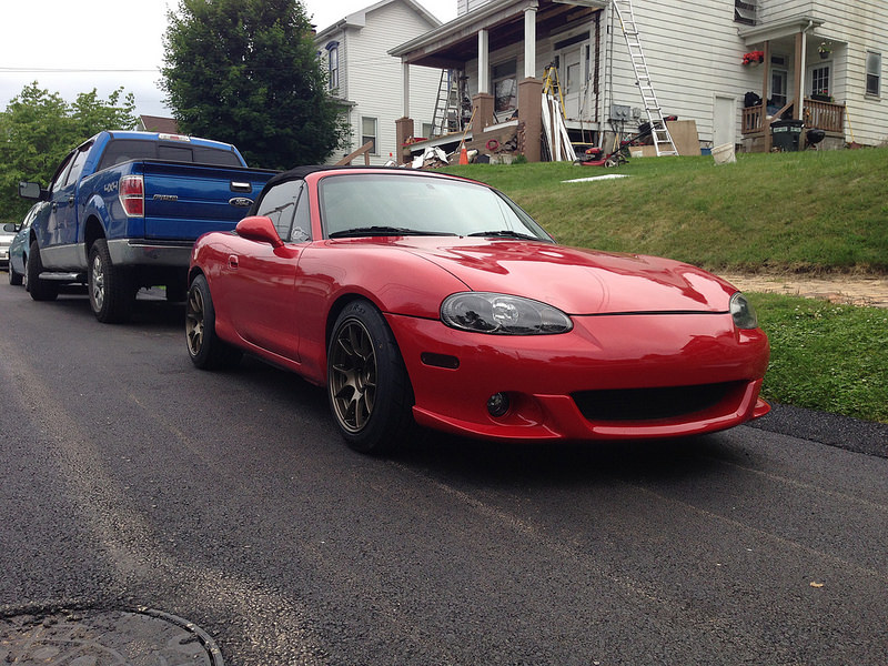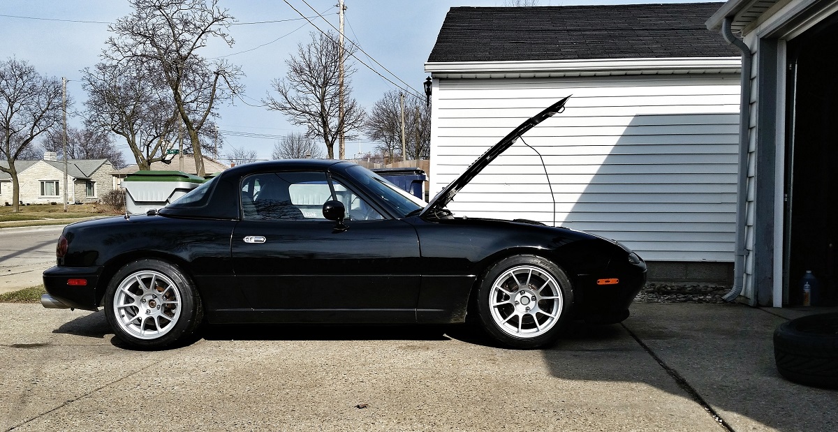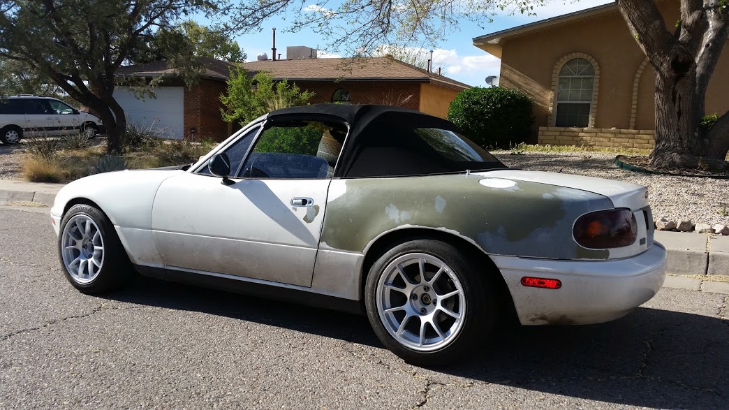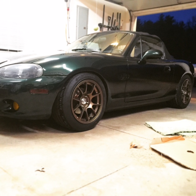 No fender rolling necessary, love how these look. They're mounted on an NB2 with vmaxx xtremes track pack coilovers. Tires are 225/45/15 RS3's. Tires clear the fenders perfectly fine. The tire does show witness marks adjacent to the top hat on the inside of the wheel well in the fronts (I don't have fender liners, so I don't recall if this area is normally covered, regardless, it makes contact there).