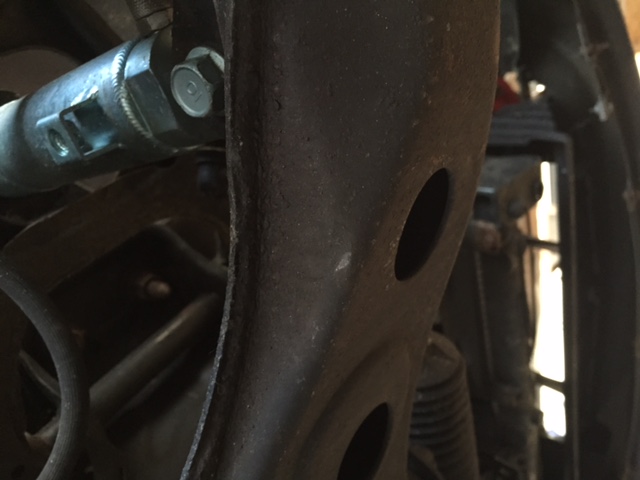 The area of slightly more concern is the front lower A-arms (rear under side). This area seems to make contact with the 2nd radius (middle of three steps) adjacent to the wheel bore. In static state there is plenty of clearance (an inch?). I tried loading it up with the wheel up with the car in the air and it gets closer, but doesn't touch. So it must be dynamic loading near bumpstop territory thats creating contact. It has made contact 360 deg around the wheel right on the radius. Not more than 5 mils depth (0.005") though, so its really only surface damage. I was on some roads with some big dips today, so I don't expect it to make any further contact, but I'll likely see at auto-x tomorrow.