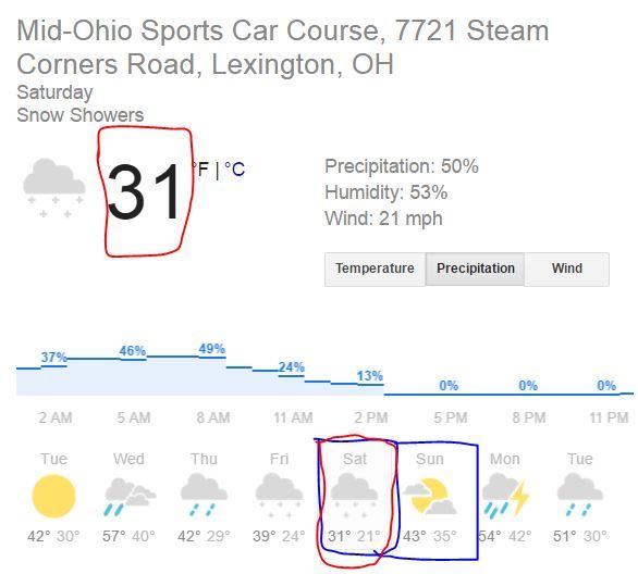 Well, the weather looks beyond cold for this weekend at Mid-Ohio. Even Sunday which was supposed to get to 60 is now showing a mere 43... I'm not sure I'll run these at the risk of ruining them. Anyone recommend a good FREEZING weather tire?! I'm thinking 205 R1R's or even some 195 BFGoodrich - g-Force Sport Comp-2