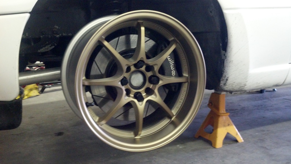 So I sold my bronze 6UL 8's for the price of this complete set-up. I was looking for something different and 6UL's defiantly aren't it. I wanted something with a bit more of an aggressive stance and still fit 225's under the fenders. When Goodwin announced the FlatOut's and said they fit over Wilwood's I knew they were for me.