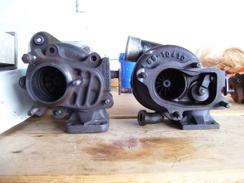 I have no friggin' idea what turbo I have on the shelf. It's some AiResearch turbo - from where, I dunno. The foot would require some modification of the boltholes to make it fit the GReddy manifold. Plus, it has some bolt-on flapper wastegate and a three-bolt, round exhaust flange. This turbo would be too much work to modify.